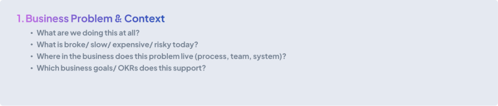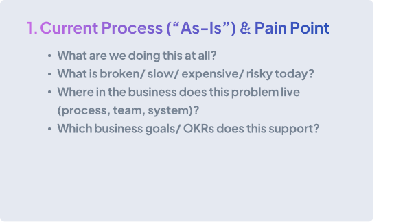 What’s broken today, and what success looks like (time, cost, revenue, risk, CX).